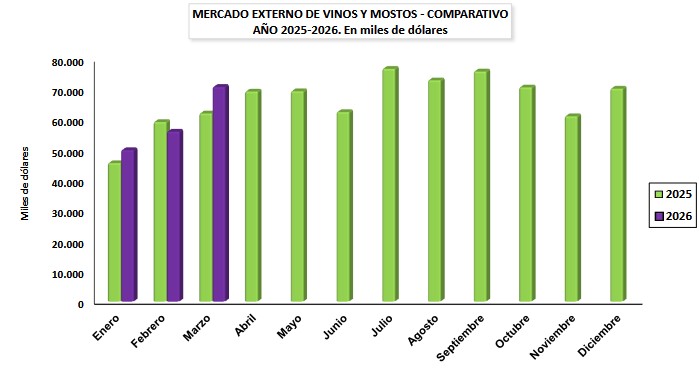 El valor FOB de las exportaciones argentinas de vinos y mostos durante enero-marzo 2026 totalizaron los U$S 176.819.000 lo que representa un crecimiento del 5,9% con respecto a igual período del año anterior.