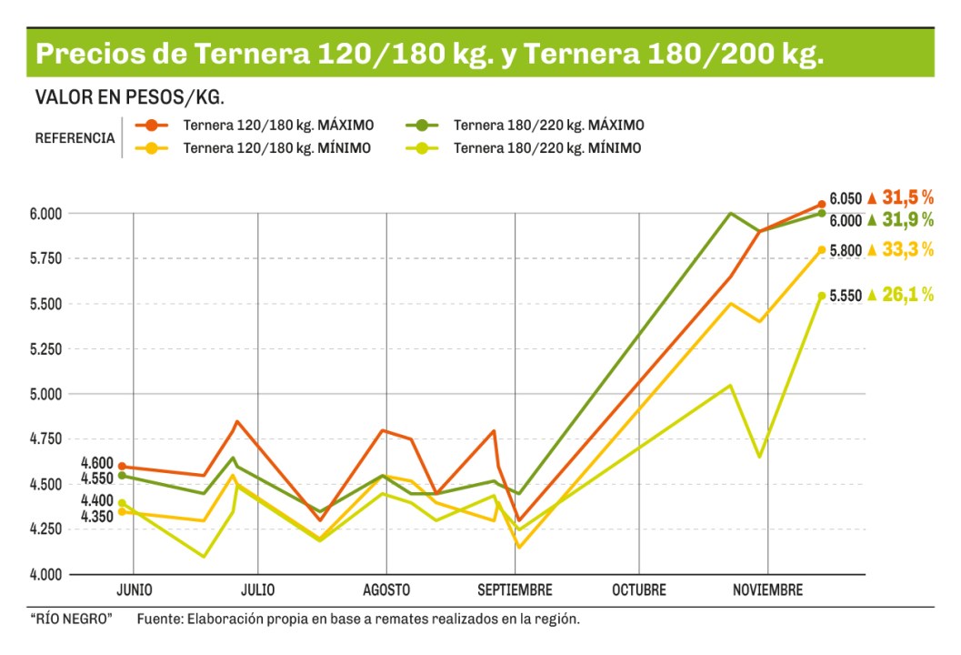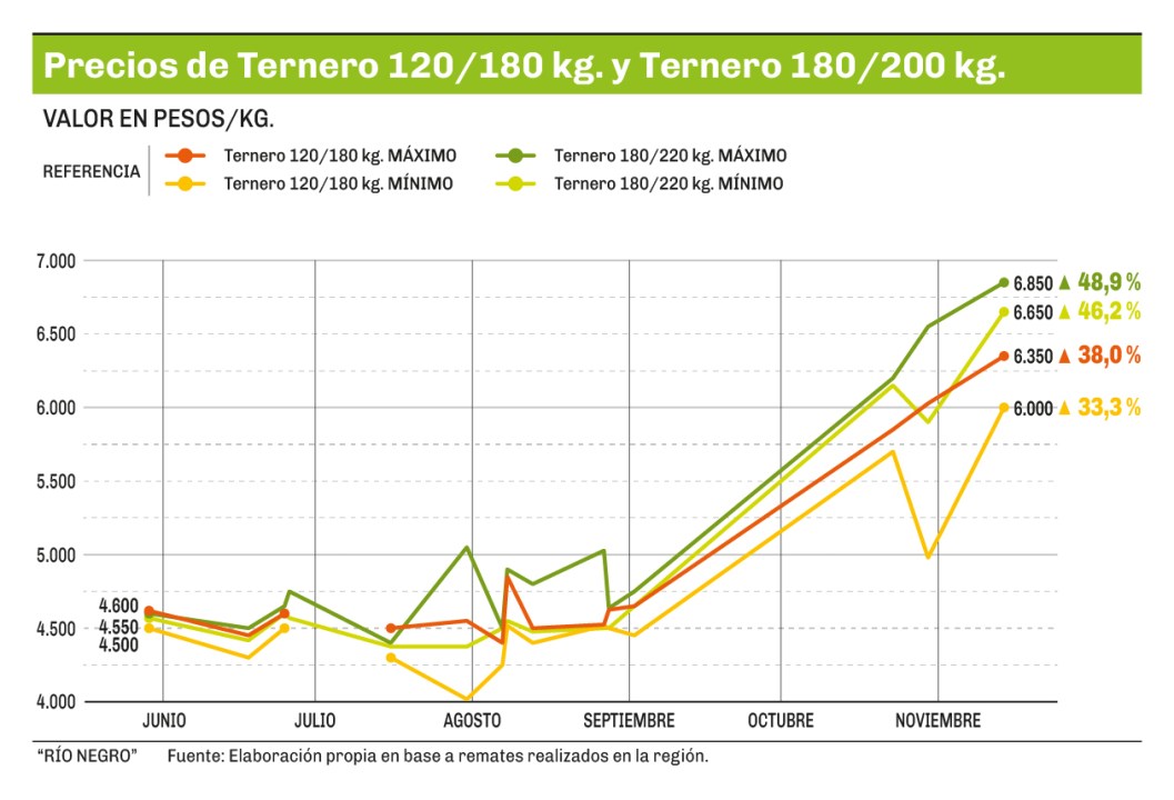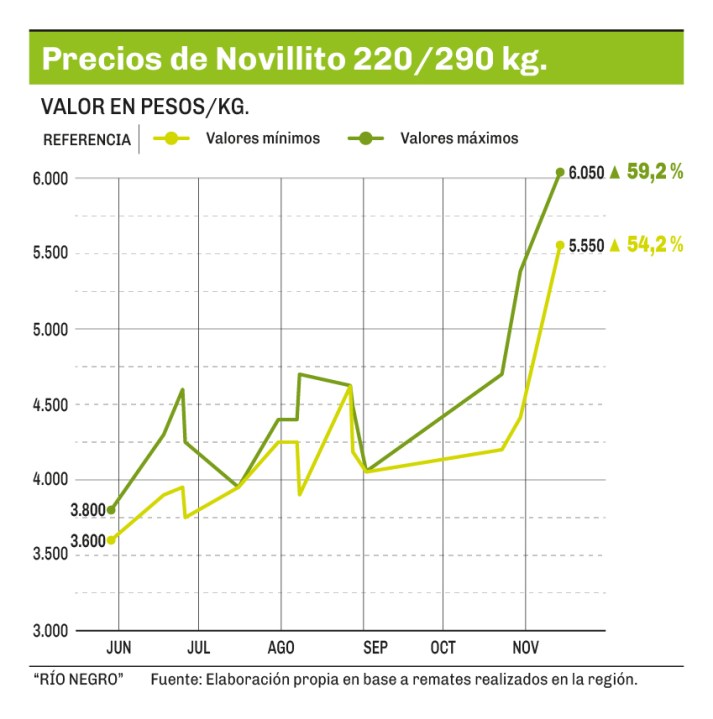 En los últimos seis meses los valores de la hacienda comercializada en los remates de Río Negro aumentaron entre un 30 y un 60%. El salto más fuerte fue para el novillito, que pasó de $3.800 el kilo en mayo de este año a $6.050 en las subastas de mediados de noviembre. Las causas que explican este presente ganadero.