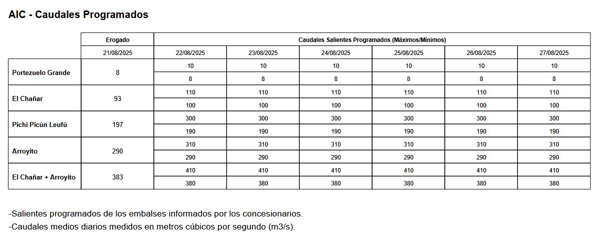 Caudales salientes programados por las represas de Río Negro y Neuquén hasta el 27 de agosto