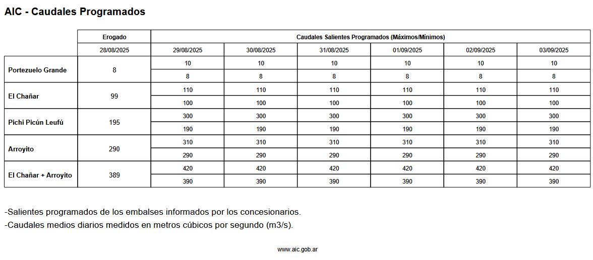 La Autoridad Interjurisdiccional de Cuencas (AIC) emitió un nuevo cronograma de caudales salientes programados en sus máximos y mínimos hasta el próximo miércoles 3 de septiembre. Una información que sirve para planificar actividades en la ribera de los ríos o para conocer cuánto caudal habrá disponible para las áreas bajo riego.