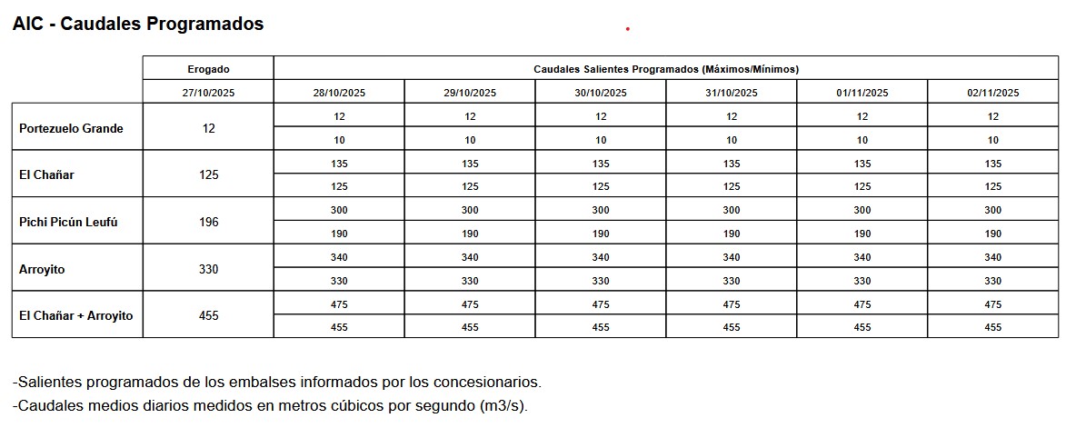 Caudales salientes programados por las represas de Río Negro y Neuquén hasta el domingo 2 de noviembre