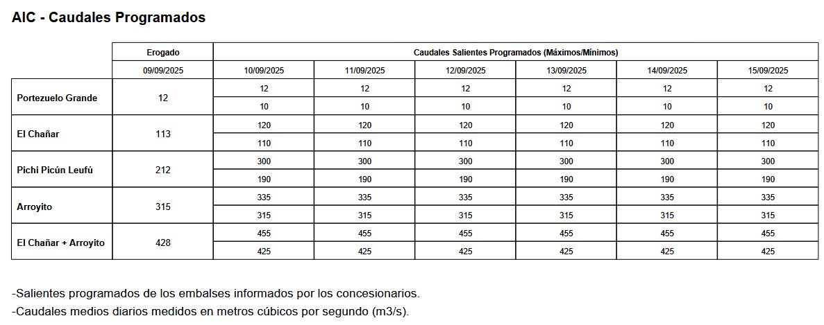 Caudales salientes programados por las represas de Río Negro y Neuquén hasta el lunes 15 de septiembre