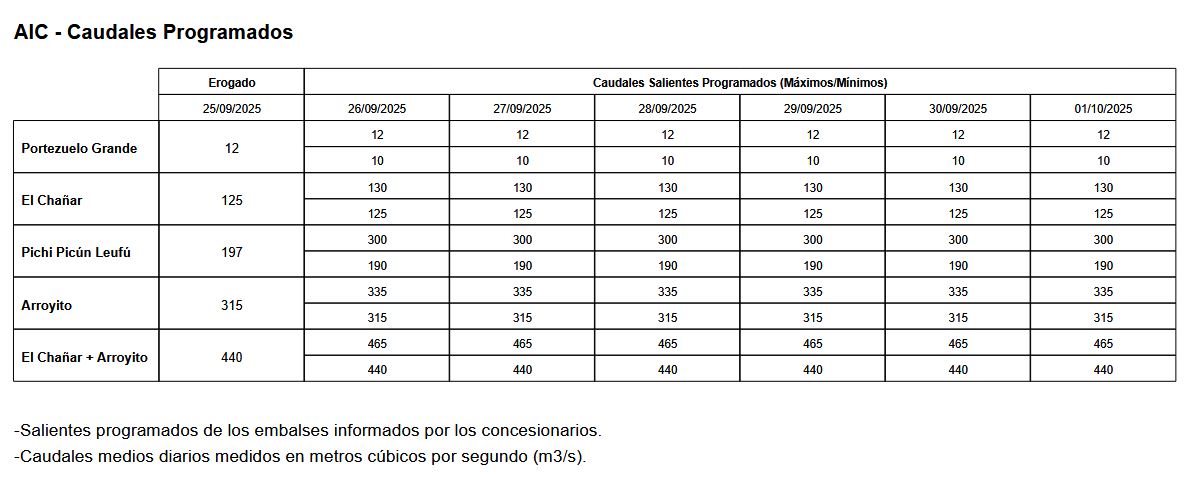 La Autoridad Interjurisdiccional de Cuencas (AIC) emitió un nuevo cronograma de caudales salientes programados en sus máximos y mínimos hasta el próximo miércoles 1 de octubre. Una información que sirve para planificar actividades en la ribera de los ríos o para conocer cuánto caudal habrá disponible para las áreas bajo riego.