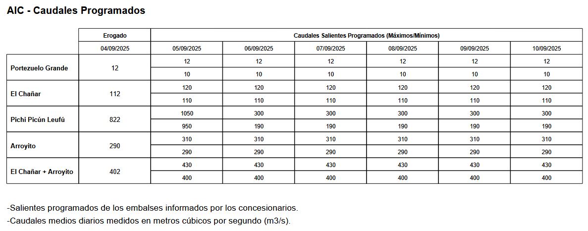 Caudales salientes programados por las represas de Río Negro y Neuquén hasta el miércoles 10 de septiembre
