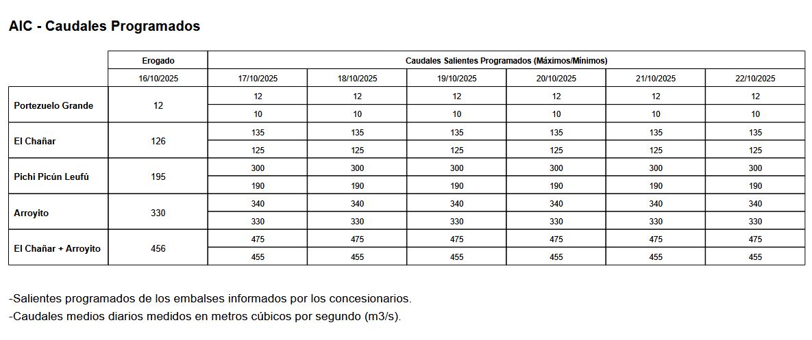 La información de caudales programados estará disponible cada semana en este espacio de Río Negro Rural.