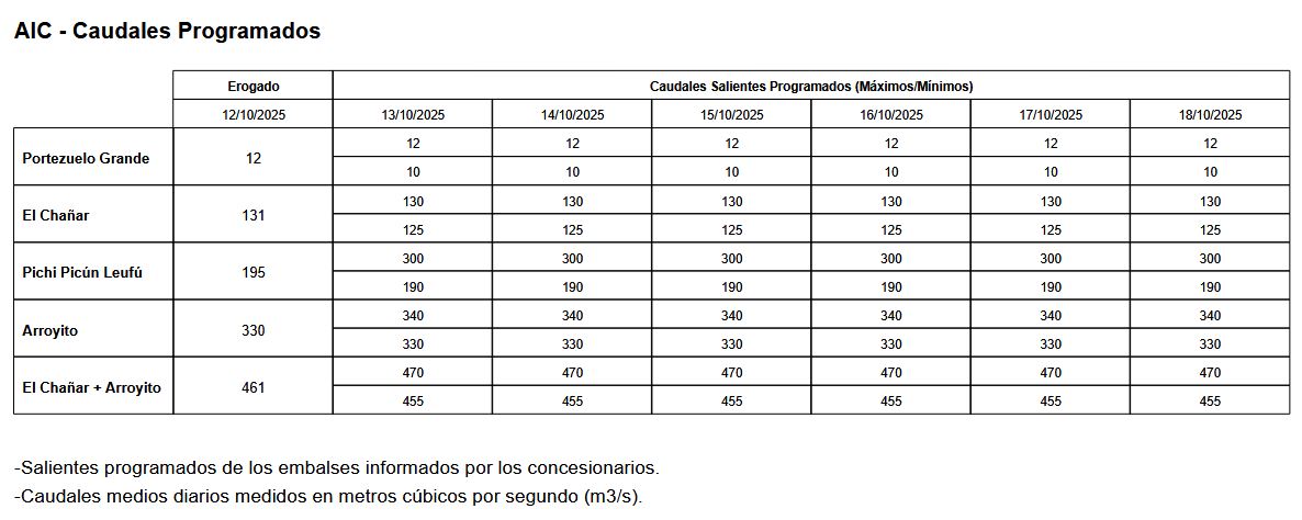 Caudales salientes programados por las represas de Río Negro y Neuquén hasta el sábado 18 de octubre