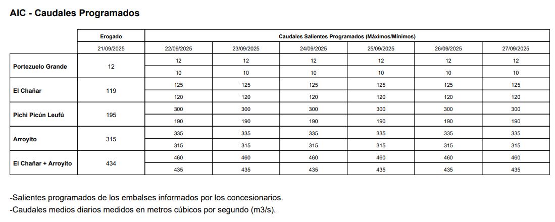 Caudales salientes programados por las represas de Río Negro y Neuquén hasta el sábado 27 de septiembre