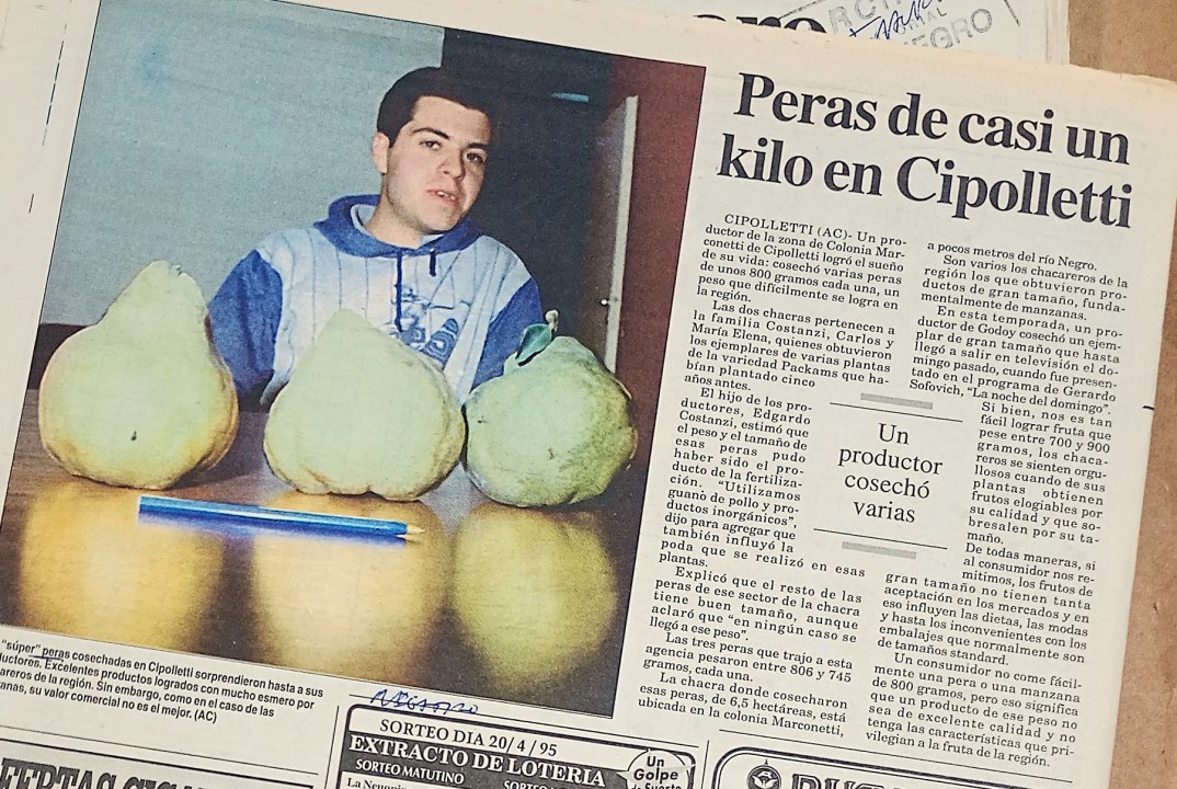Poda y fertilización con guano de pollo y productos inorgánicos eran, por ejemplo, las posibles razones que encontraba Edgardo Constanzi para que tres peras de la variedad Packham’s Triumph superaran los 800 gramos en la zona de la Colonia Marconetti, entre las Rutas 65 y 22, en Cipolletti. Salidos de las hectáreas de su familia, estos hallazgos fueron compartidos en abril de 1995, según el archivo de RÍO NEGRO.