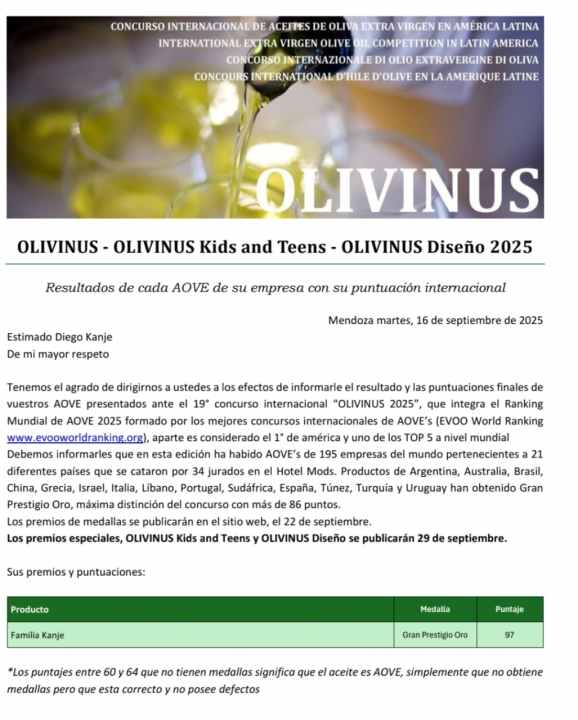 Familia Kanje participó en Olivinus 2025, un concurso que reconoce a los mejores aceites de oliva extra virgen de distintos países. Obtuvo 97/100 puntos.