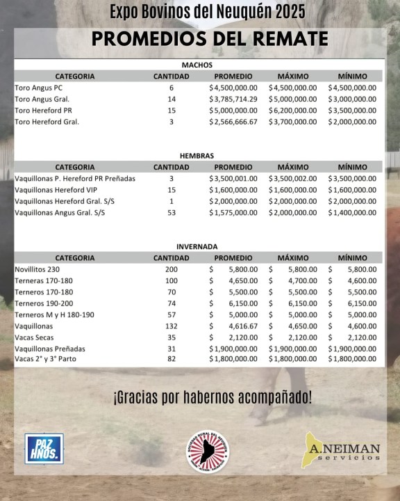 Expo Bovinos 2025: así fueron los precios de venta del remate realizado en Junín de los Andes