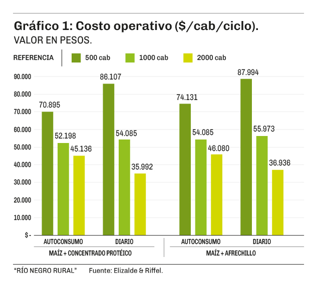 Por lo tanto, se cumple con la presunción de que la alimentación con silos de autoconsumo resulta en un método simple y más económico desde el punto de vista de los costos operativos (costos generados para dar de comer) respecto del suministro diario, sobre todo en escalas chicas (menos de 1.000 cabezas). Sin embargo, esto no significa que se trate de un sistema de menor costo de alimentación (o de mejor resultado económico) por kilogramo producido, ya que se debe tener en cuenta el costo de ambos tipos de raciones. Por esto, es fundamental evaluar cómo varían los resultados económicos del engorde a corral según el sistema de alimentación implementado (incluyendo el costo de la ración) y la escala del encierre.
