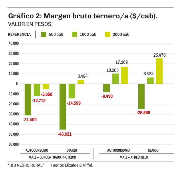 - La escala potencia la diferencia entre raciones, dado que la ración maíz-afrechillo tiene márgenes neutros a positivos a escala creciente respecto de la ración maíz-concentrado proteico.