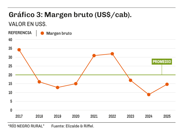 La última conclusión se repite en forma consistente durante el período en que se vienen comparando las raciones. El Gráfico 3 muestra la diferencia en el margen bruto (en US$/cab) entre la ración maíz-afrechillo respecto de la de maíz-concentrado proteico durante el período 2017 a 2025, con un promedio de US$20/cab ($30.000/cab valor actual). Las variaciones entre años se deben a las variaciones relativas (en US$) para todos los factores que intervienen en el proceso (precios de insumos, costos directos, valor de la hacienda, etc.), pero las diferencias son siempre favorables (positivas) para la ración maíz-afrechillo. Así, para un encierre de 1.000 cabezas promedio, la diferencia entre elegir una ración u otra a lo largo de nueve años ascendería a… ¡US$180.000!