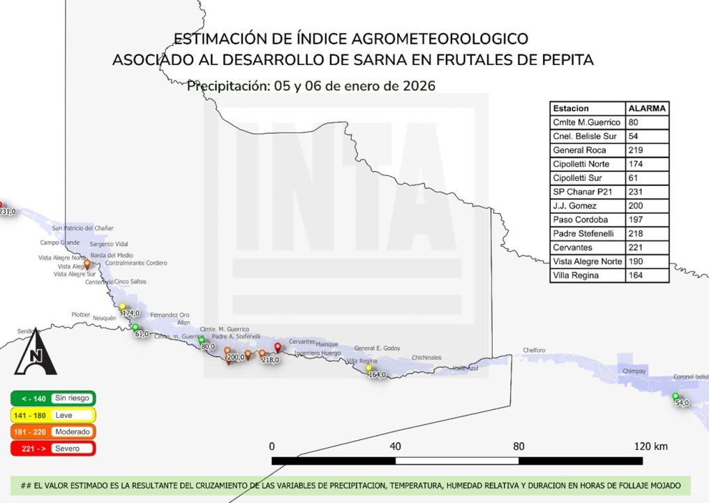 Las condiciones meteorológicas del 5 de enero de 2026 generaron condiciones predisponentes para la infección de sarna y mancha marrón del peral, a días de que se inicie la cosecha. Los valores del índice de riesgo de infección varían a lo largo de las localidades del Alto Valle, con San Patricio del Chañar (Neuquén), Cervantes y General Roca (Río Negro) encabezando el ránking de peligrosidad.
