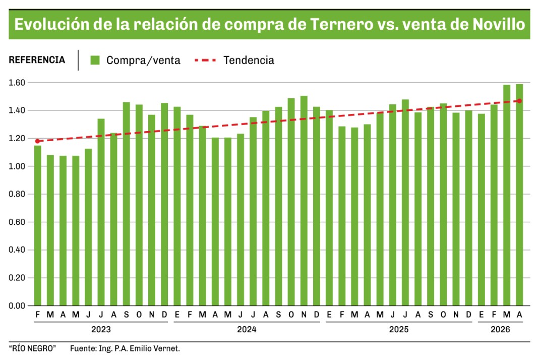 Hoy, cuando uno se pone a analizar la relación compra-venta de un ternero versus un novillo, se encuentra que la relación es bastante desfavorable para salir a comprar terneros. Hoy la relación está en 1,56 (es decir, se necesita vender 1,56 kilos de novillo terminado para poder comprar 1 kg de ternero de invernada), cuando la relación promedio es de 1,33 desde el 2023 a la actualidad, lo cual afecta negativamente el margen bruto de esta actividad.