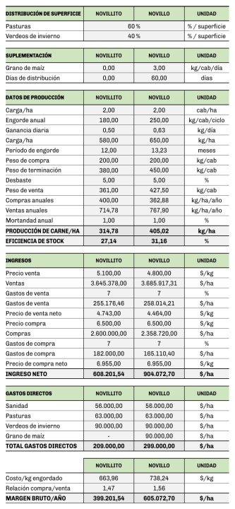 Como se puede ver en el cuadro siguiente, el margen bruto obtenido por engordar novillitos hasta los 380 kg/cab es de $399.201,54 por hectárea, frente a los $605.072,70 por hectárea logrados si esos mismos novillitos los vendemos después como novillos terminados a los 450 kilos brutos. Esto representa un aumento del 51,57% en el margen bruto, lo que mejora notablemente la rentabilidad.