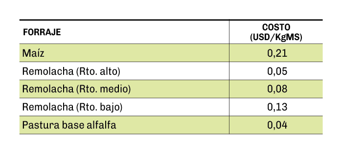 El costo por kilo de carne producido en cualquiera de los tres escenarios productivos de remolacha está muy por debajo del costo de un engorde tradicional basado en una dieta con alto porcentaje de grano. Para el caso de la remolacha de alto rendimiento, el costo es la tercera parte (US$ 0,6/kg producido) respecto de la dieta tradicional (US$ 1,9/kg producido). Para el caso del rendimiento medio de remolacha, el costo es la mitad (US$ 0,9/kg producido). Para la producción de carne sobre pasturas base alfalfa, vemos que el costo por kilo ganado es comparable al sistema de alto rendimiento de remolacha (US$ 0,5 vs. US$ 0,6/kg producido).