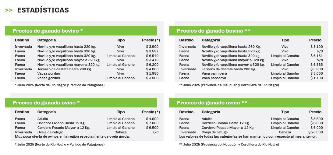 La estadística del suplemento Rural suma nuevos datos para que estés más informado. A los valores promedio de la venta de hacienda bovina y ovina en la Patagonia se agregó el de los precios de porcinos.