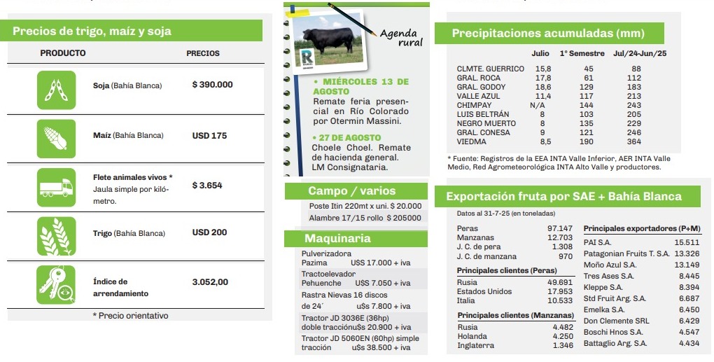 Río Negro Rural te acerca los últimos precios obtenidos en los remates de hacienda en la región, en este caso realizados en Stroeder y General Conesa. Además, una actualización de las precipitaciones en las distintas zonas productoras de la provincia, y otros valores de referencia del mercado.