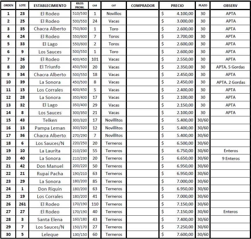 A continuación el listado completo de la hacienda que salió a venta y los precios obtenidos por cada categoría.