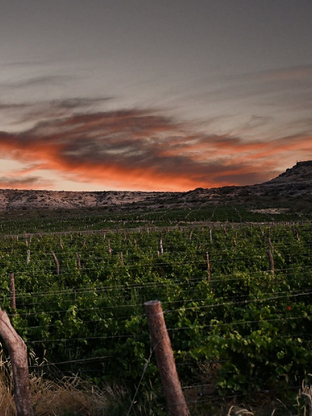 Un sereno atardecer en la bodega Ribera del Cuarzo. En primer plano, una plantación de vid. De fondo, las clásicas bardas norpatagónicas.