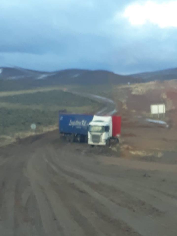 Las lluvias y nevadas de las últimas horas dejaron como consecuencia sectores con abundante barro y charcos de agua en los tramos de ripio donde, la construcción de la obra de pavimentación, obligo a las empresas viales a realizar desvíos por suelos poco compactados. Durante la mañana de hoy, algunos automovilistas informaban a los distintos medios de comunicación la presencia de un camión atravesado y cortando gran parte de la calzada, en la zona del Puesto Blanco, entre Jacobacci y Clemente Onelli.