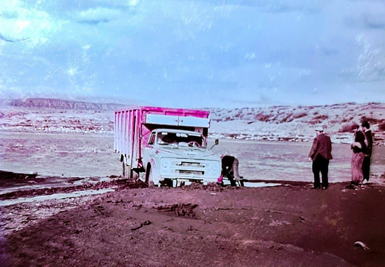 “Salimos de Chos Malal y cuando llegamos al río se mandó crudo como venía, convencido de que pasaba. Se clavó de punta, el agua se vino encima, lo giró de cola y quedó mirando al oeste. Se notaba que era muy buen camionero y había pasado antes lo que en mi recuerdo eran otros dos ríos que quizás eran ramificaciones del Neuquén, peludiando un poco en el segundo nomás. Pero esto era otra cosa, a mi me parecía el Paraná«, relata Carlos.