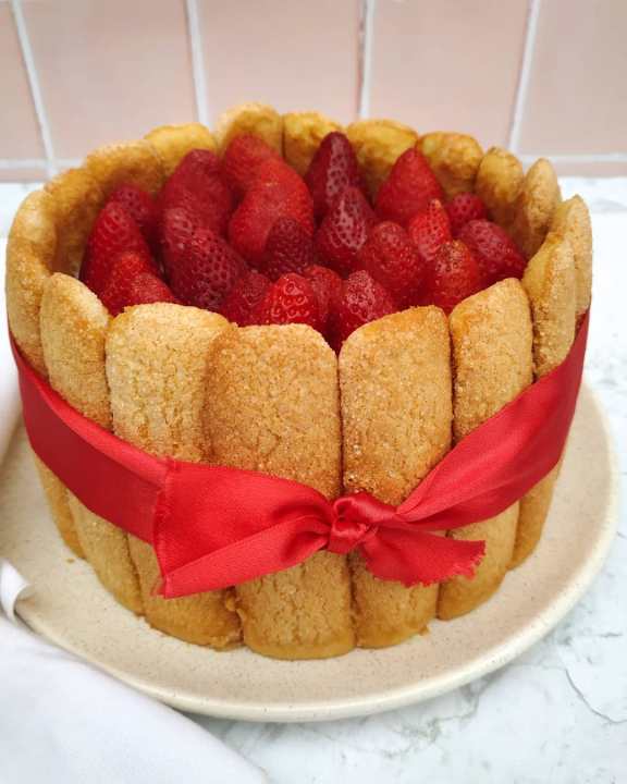 8. Retirar la crema de frutillas de la heladera. Volcar la mitad en el molde, formar una nueva capa de vainillas humedecidas en leche y completar con el resto de la crema.