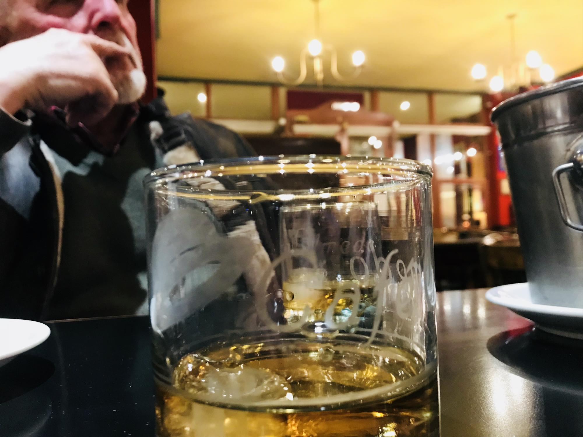 “La mecánica es la siguiente: nosotros te vendemos una botella de whisky y vos la guarda acá, con tu nombre en esa vitrina y le hacemos una marquita cada vez que venís a consumir. También por cada vez cobramos 35$ el servicio, no importa la cantidad de whisky que tomes. Se cobra una sola vez, el momento. Si venís otro dia también se te cobra una sola vez. Se contempla el hielo y la acción de servir. Si tuviésemos que cobrar por medida no tendría mucha razón de ser. Por otro lado en este bar las medidas son el doble que en todos los lugares, aquí servimos 100 cm3 de whisky”.