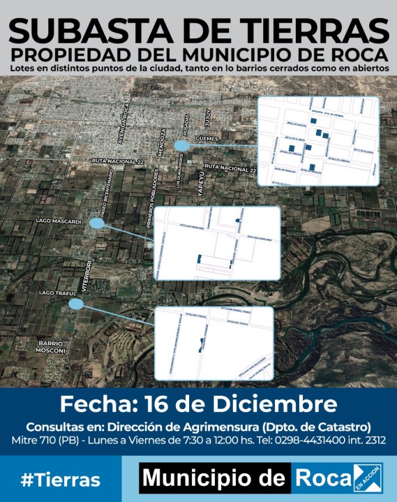 El municipio de Roca realizará el 16 de diciembre una subasta de terrenos ubicados en distintos sectores de la ciudad. Algunos de estos lotes están ubicados en barrios privados, en tanto que otros se encuentran en barrios abiertos.