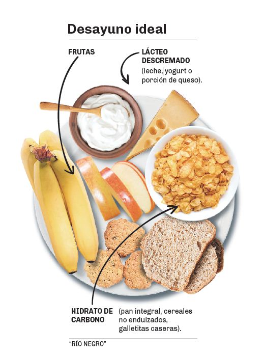 Dietrich insistió en la importancia del desayuno e identificó los tres elementos que conforman uno ideal: un lácteo descremado (leche, yogurt o porción de queso), un hidrato de carbono (pan integral, cereales no endulzados, galletitas caseras) y una fruta.