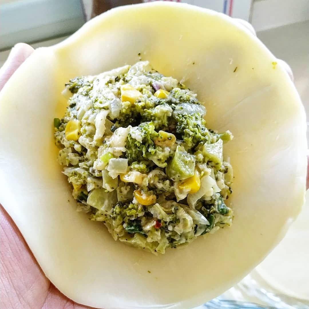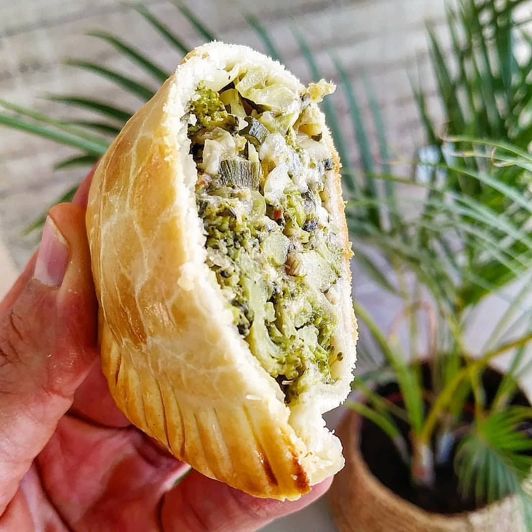 Sofreímos la cebolla cortada en láminas junto con los granos de choclo crudos en abundante oliva. Luego le agregamos el brócoli cortado en trozos pequeños. Si es necesario me agregas media copa de vino blanco o leche y cocinamos unos minutos tapado. Apagamos la hornalla. Finalmente le ponemos el queso parmesano fresco rallado, los condimentos, sal y último la cebolla de verdeo cruda cortada en rodajas. Armamos las empanadas, repulgamos, pintamos con huevo, le damos horno fuerte hasta que doren y a la mesa.