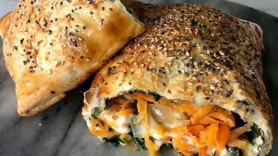 Lavar y cortar las espinacas. Reservar. Espolvorear sobre una de las masas hojaldradas con orégano y ají molido, pasar un palote para que se adhiera y luego colocar en el centro las espinacas, la cebolla rehogada, la zanahoria rallada, salpimentar, acomodar bastones de muzzarella y completar con más espinacas.