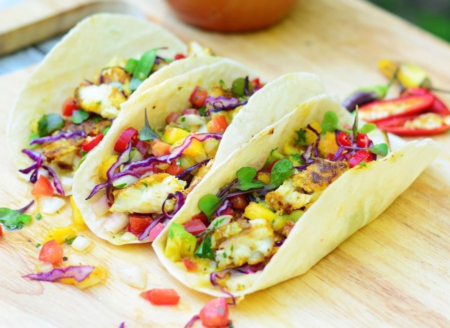 Condimentar los filets con sal, pimienta, cúrcuma y pimentón. Calentar aceite de oliva en la sartén. Dorarlos 2 minutos de cada lado. Deben quedar bien jugosos. Retirarlos del fuego y preparar la salsa. Cortar el mango en cubos chicos. Cortar la palta en cubos de similar tamaño. Picar el chile bien chiquito. Agregar el repollo en laminas finas y el hinojo. Mezclar todo en un bol y rociar con jugo de limón y aceite de oliva. Condimentar con sal y pimienta. Armar los tacos con los la salsa de mango y el pescado en trozos. Terminar con brotes.