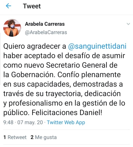 El legislador Daniel Sanguinetti será el nuevo secretario General de la Gobernación, según lo anunció esta mañana la gobernadora Arabela Carreras.