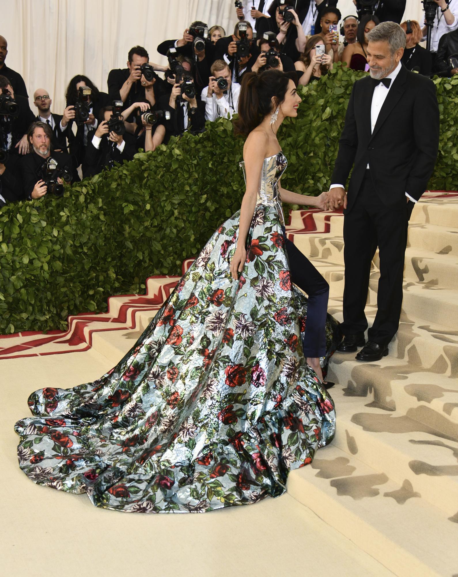Amal Clooney, copresidenta del evento, llegó temprano en un llamativo corsé plateado, pantalón de vestir azul marino y una falda estampada de rosas que caía en cascada. El conjunto, del diseñador Richard Quinn, hacía un crujido mientras caminaba.