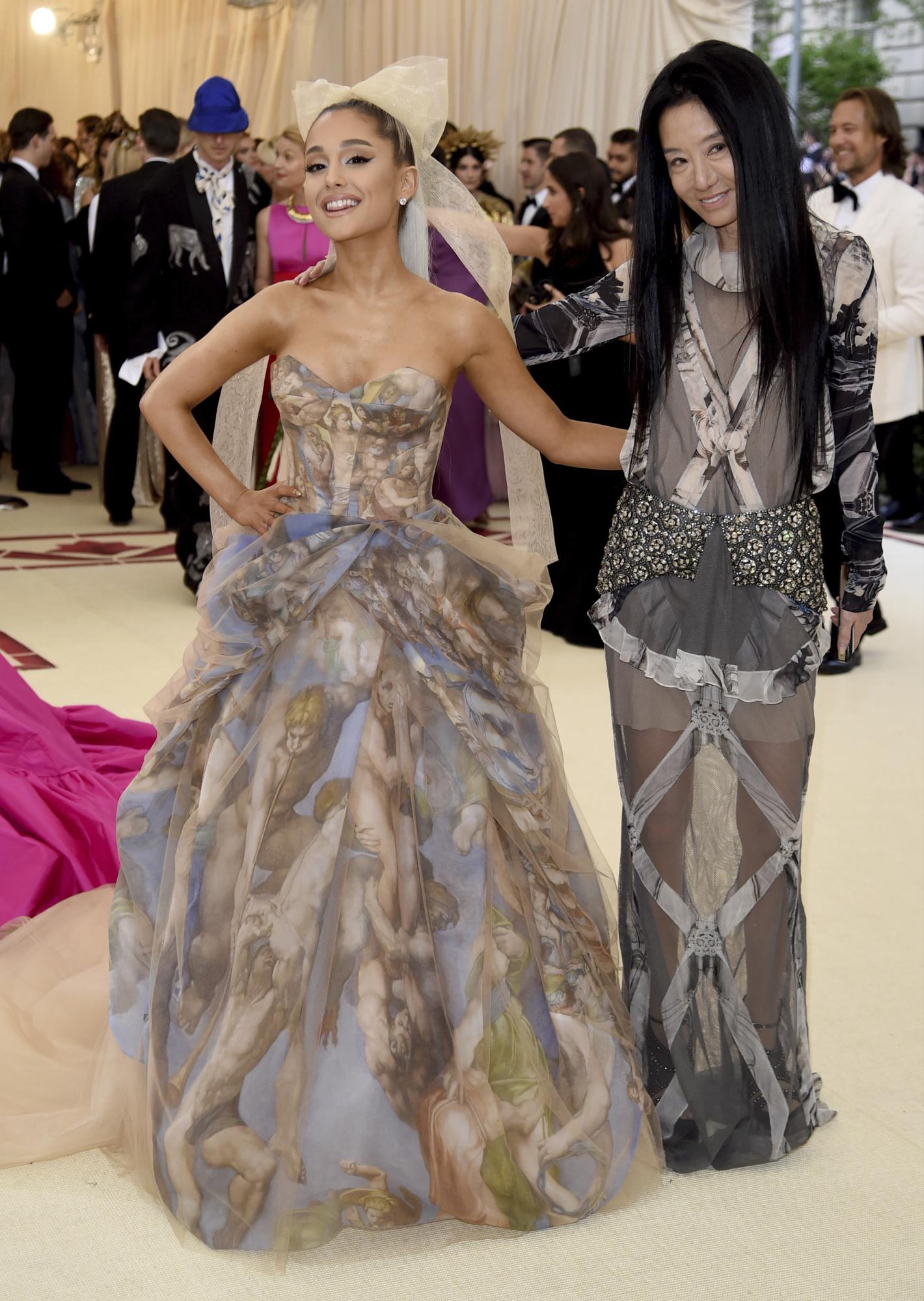 Ariana Grande llegó en un diseño de Vera Wang, quien creó para la cantante un look romántico: un traje sin tirantes de suaves capas estampadas con “El juicio final” de Miguel Ángel, sobre un tul rosáceo.