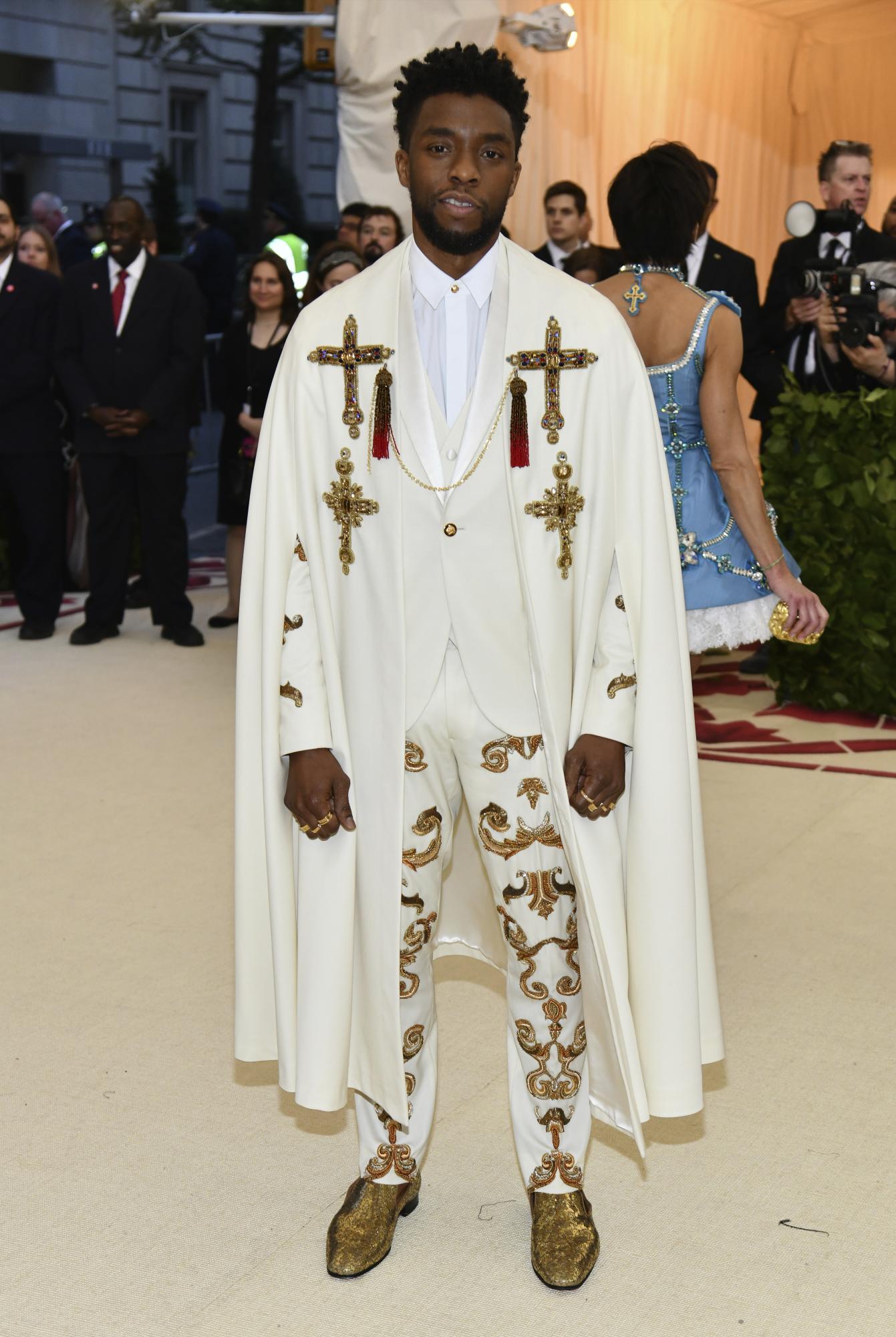 El astro de “Black Panther” Chadwick Boseman lució una capa color marfil con símbolos religiosos bordados en oro