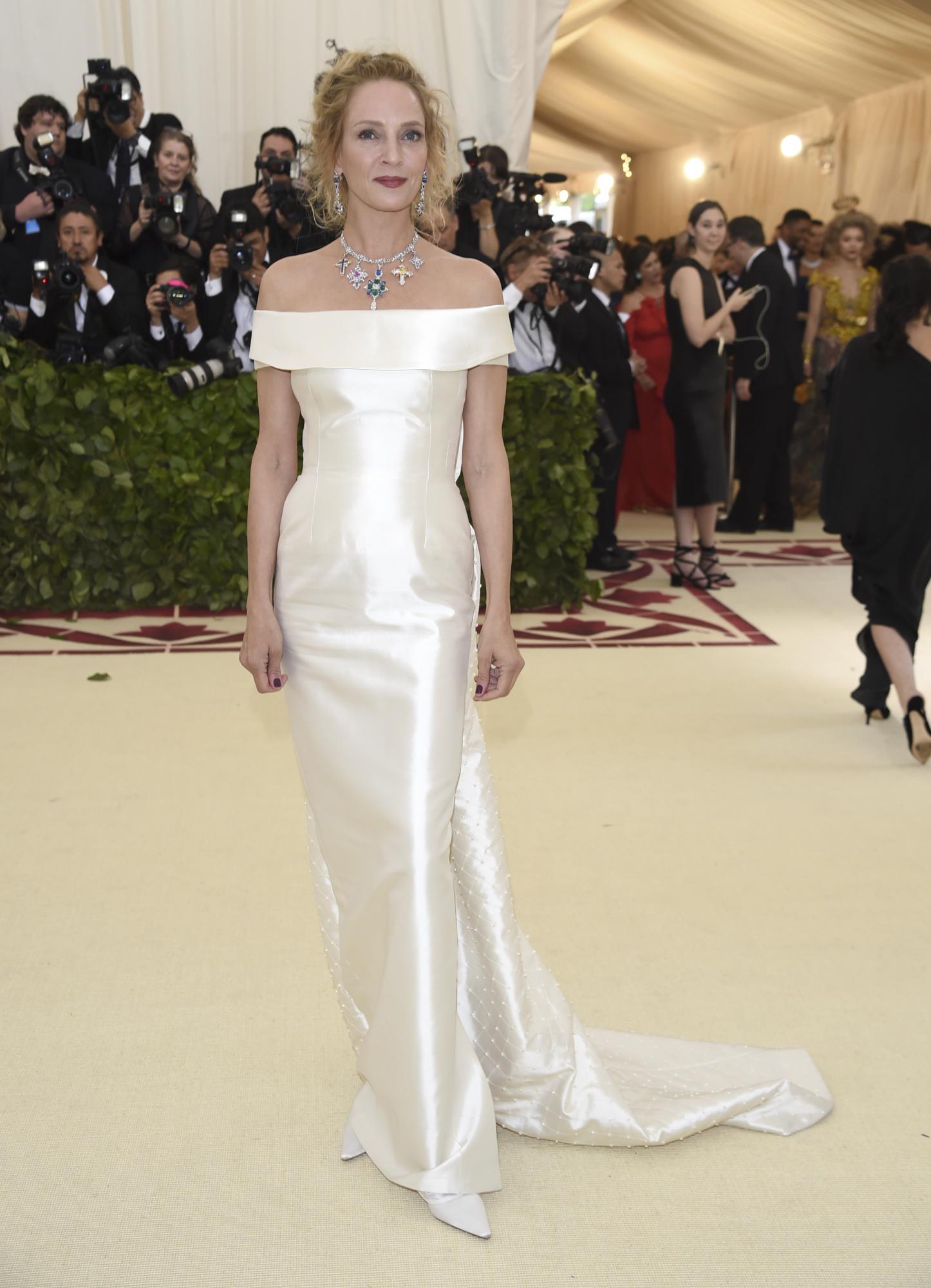 Uma Thurman complementó un vestido con hombros descubiertos y perlas incrustadas de Gabriela Hearst con un collar de cruces brillantes.