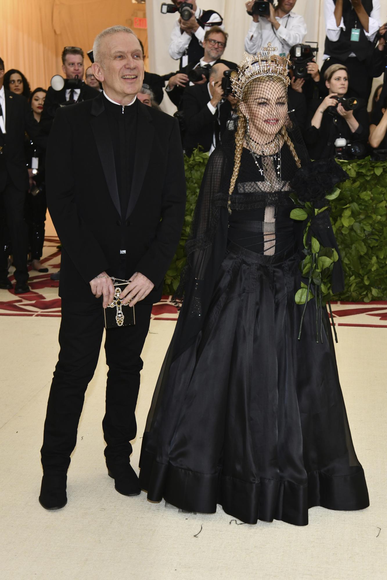 Entró de la mano de Jean-Paul Gaultier y llevaba el pelo en dos trenzas, con una corona de cruces, espléndida en una de sus creaciones, un gran vestido negro con transparencias que formaban una cruz en su torso, con un ramo de rosas totalmente negras y un velo calado sobre el rostro.