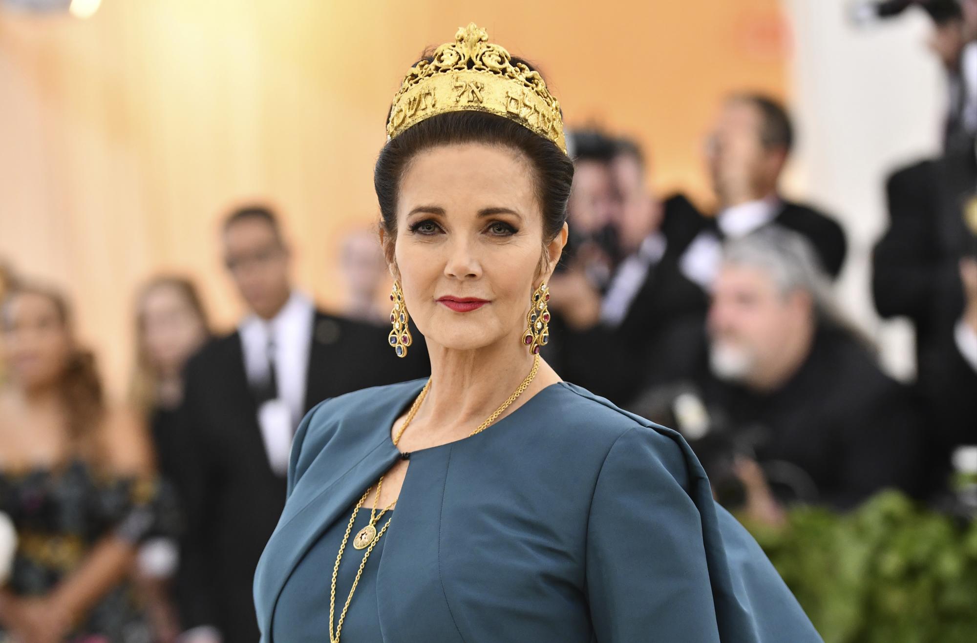El peinado recogido de Lynda Carter incluyó una corona y una resplandeciente estrella de David.