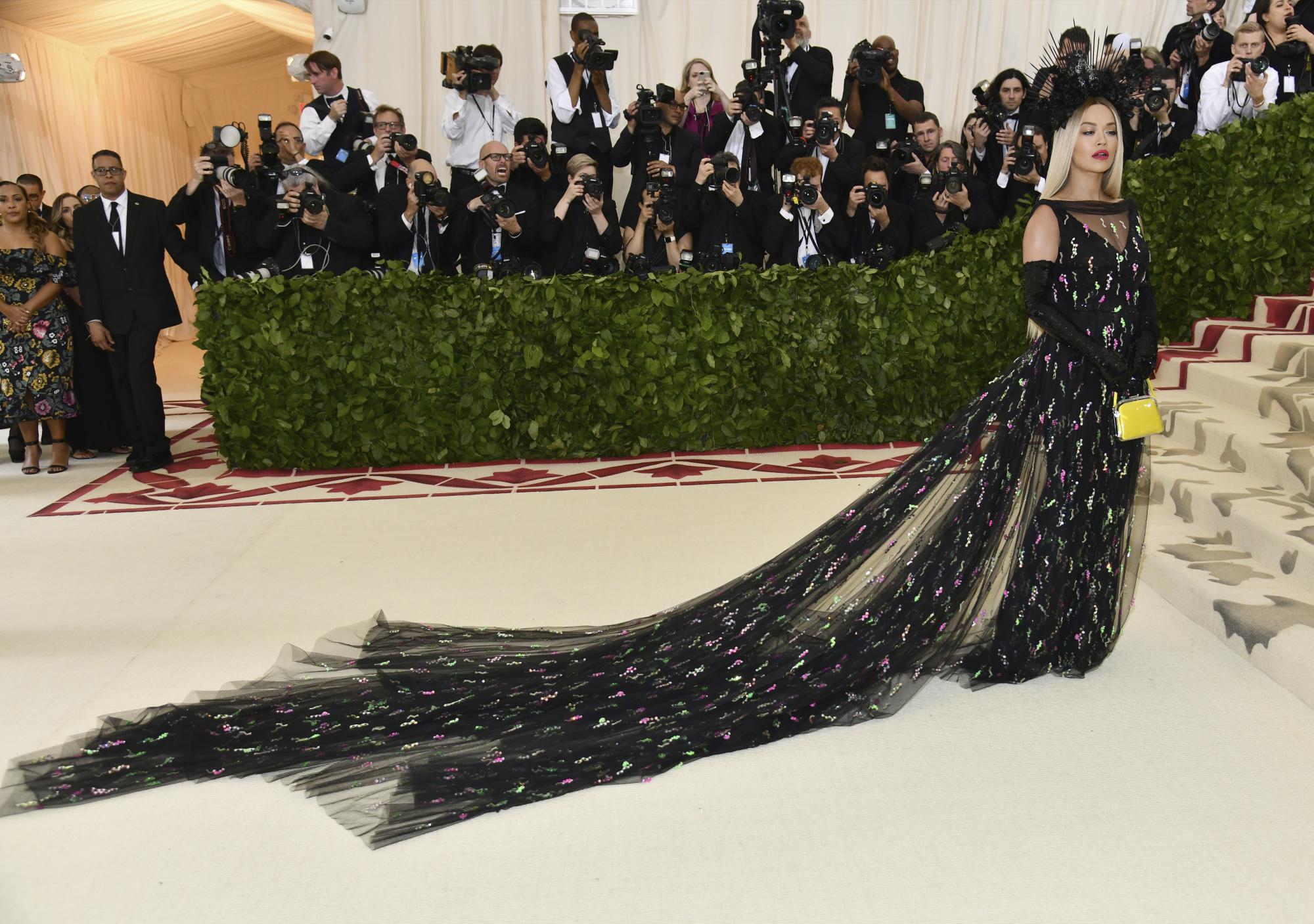 Rita Ora arrastró una enorme cola mientras los fotógrafos tomaban numerosas fotos de su elaborado tocado de pinchos que combinó con un vestido negro de Prada en capas y guantes de lentejuelas.