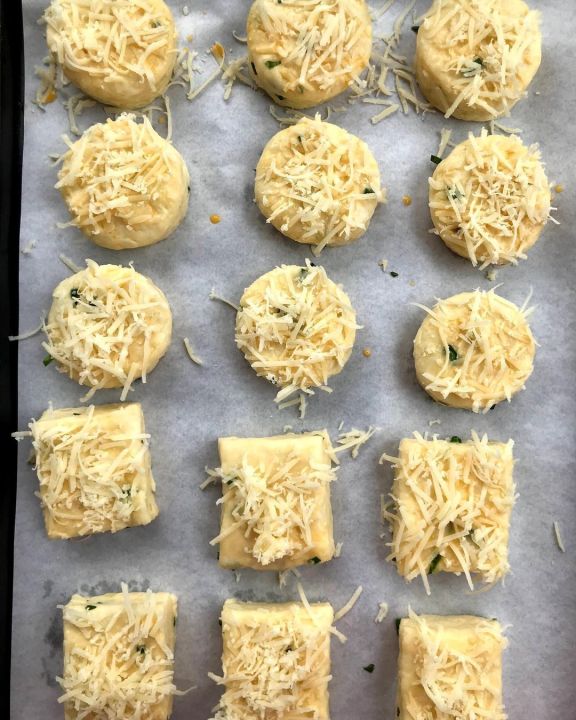 3- Con la masa fría, estiramos y dejamos un grosor de unos 3 a 4 cm. Cortar de la forma que más les guste. Pintamos con huevo y agregamos más queso en hebras por encima. Colocar en una placa aceitada o con papel manteca.