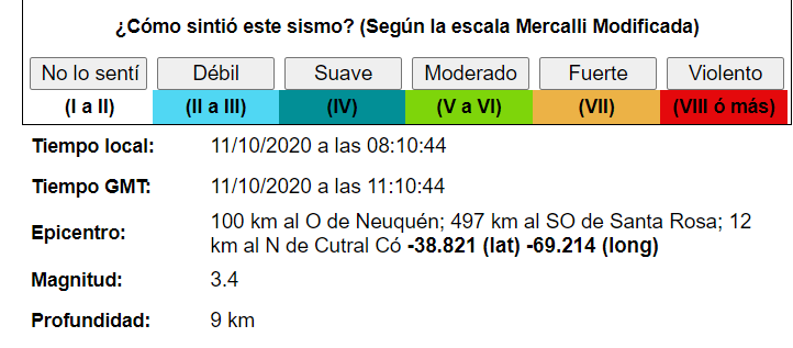 Según informó el Instituto Nacional de Prevención Sísmica, Inpres, la magnitud fue de 3, 4 grados y fue a 9 kilómetros de profundidad. Ocurrió a 100 kilómetros de Neuquén y a 497 kilómetros al SO de Santa Rosa.