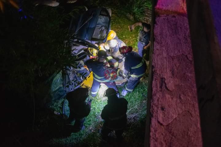 Un auto Volkswagen Voyage despistó y terminó dentro de un desagüe aledaño a la ruta. Las dos personas que circulaban sufrieron heridas y quedaron atrapadas.