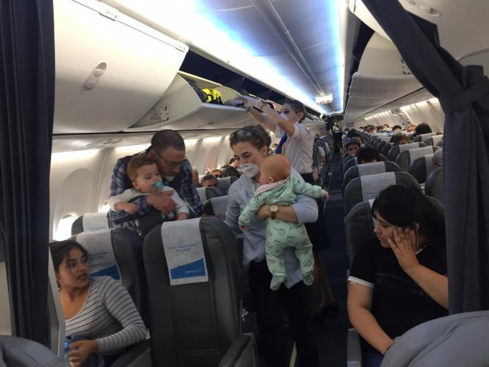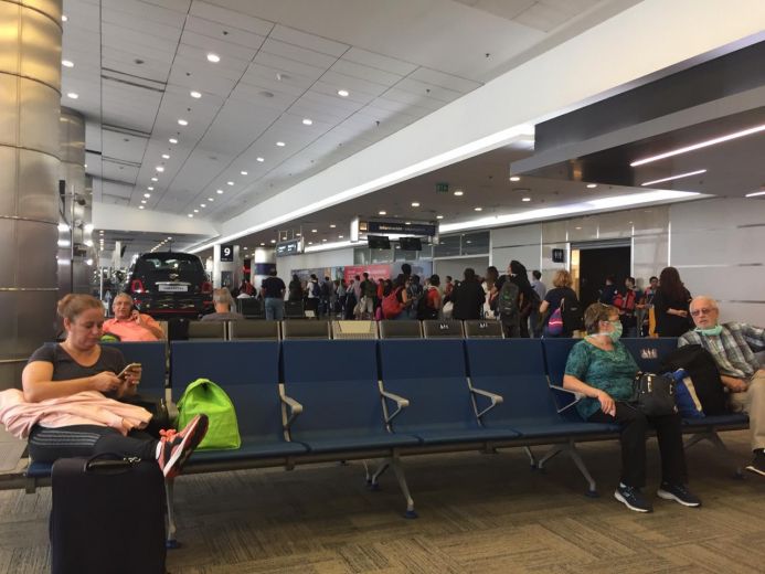 «Toman la temperatura solo en el ingreso al aeropuerto y hacen que la gente mantenga la distancia entre uno y otro pero después, no hay un asiento vacío en el avión; así que estamos sentados uno al lado del otro», comentó Gisela, una barilochense, durante la escala en Neuquén.