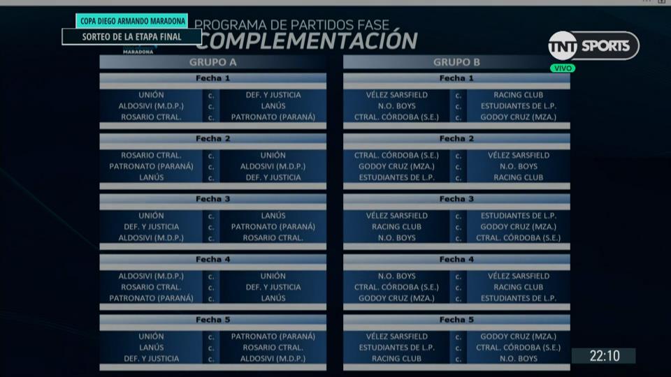 Tras las presentaciones de rigor, incluido el trofeo “Copa Diego Armando Maradona”, y la confirmación de que las finales se jugarán en San Juan, comenzó el sorteo de los grupos de la Fase Campeonato, integrado por los equipos que salieron primero y segundo en la fase de grupos, y la fase Complementación, destinada a los que terminaron tercero y cuartos en las zonas.