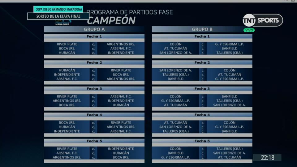 Primero fue el turno del armado de la Fase Complementación, y luego de la Campeonato donde quedó estipulado que Boca y River formarán parte del Grupo A, el “de la muerte” si se tiene en cuenta que también lo integran Independiente, Huracán y Arsenal.