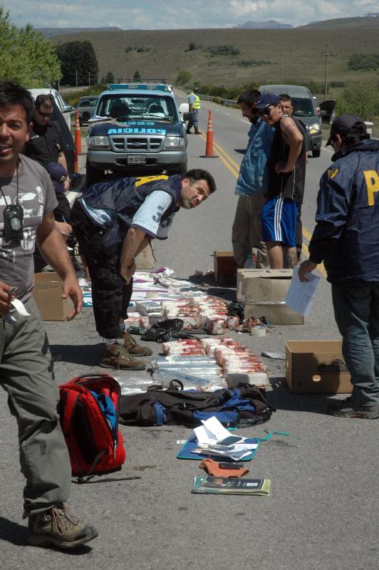 Pocas horas después, a 4 km de Junín de los Andes, y con un espectacular despliegue sobre la Ruta 40, policías federales detuvieron a siete personas, entre ellas cinco ciudadanos chilenos, que se desplazaban en un sedán blanco marca Cherry, patente DV-DD-70, de Chile, y en un Peugeot 306, patente BWR-655. Transportaban unos 60 panes de marihuana escondidos en tres mochilas. Habría involucrados unos 100 kilos de droga. Los sospechosos fueron puestos a disposición de la justicia federal de Zapala. Según trascendidos ayer por la tarde a ultimas horas y anoche también se realizaron dos operativos en San Martín de los Andes, en el marco del allanamiento y posterior incautación de casi 100 kg de marihuana y detención de 7 personas mayores de edad. Uno de los allanamientos se realizó en el barrio Cantera y el otro en un lote del barrio Ruca Hue, siendo este ultimo positivo, en donde se secuestraron elementos probatorios de interés para causa como una balanza, envoltorios de nylon, un arma larga y dinero. También se llevó a cabo la detención de un hombre argentino mayor de edad que estaría vinculado a la causa. Lo trasladaron a la subdelegación San Martín de los Andes de la Policía Federal Argentina a cargo del subcomisario Fabricio Britos (ASM/AR)