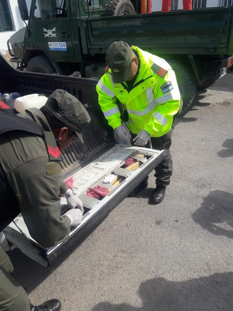 Durante el registro del sector de la caja del rodado, los funcionarios notaron que unos tornillos presentaban signos de haber sido removidos, lo que motivó a profundizar la inspección mediante el apoyo del can detector de narcóticos de Gendarmería. «La reacción exaltada del perro al pasar por la compuerta trasera, confirmo la existencia de sustancia estupefaciente», indica el comunicado de GN. .